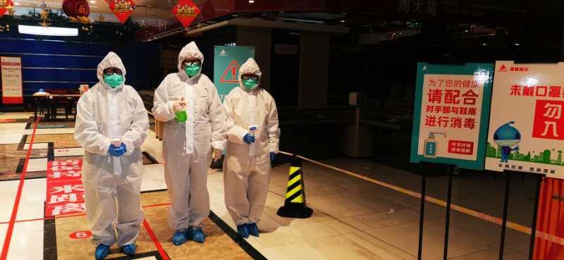 体温测量处、收银台的“女汉子”们整装待发,防护服、护目镜、手套、帽子、鞋套、口罩,互相检查防护装备。顾客登记本、消毒酒精、手部消毒液、测温枪、备用口罩一样不能少。